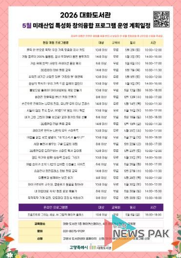 뉴스팍 배상미 기자 | 고양특례시 대화도서관은 가정의 달을 맞아 오는 5월 ‘미래산업 특성화 창의융합 프로그램’을 운영한다고 24일 밝혔다.