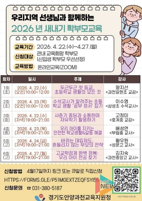 뉴스팍 배상미 기자 | 경기도안양과천교육지원청은 오는 4월 22부터 27일까지 관내 신입생 학부모를 대상으로 ‘우리지역 선생님과 함께하는 2026년 새내기 학부모 교육’을 개최한다.