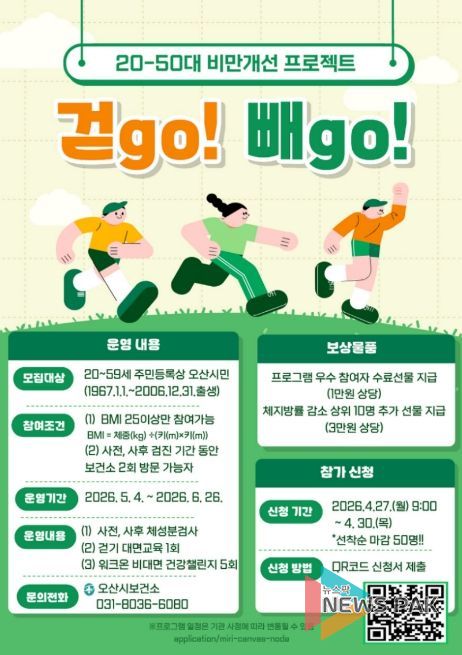 뉴스팍 이소율 기자 | 오산시보건소는 최근 젊은 층의 비만율 증가에 대응해 체질량지수(BMI) 25kg/㎡ 이상인 20~50대 오산시민을 대상으로 걷기 기반 비만 개선 프로그램 ‘걷GO 빼GO’를 운영한다고 밝혔다.