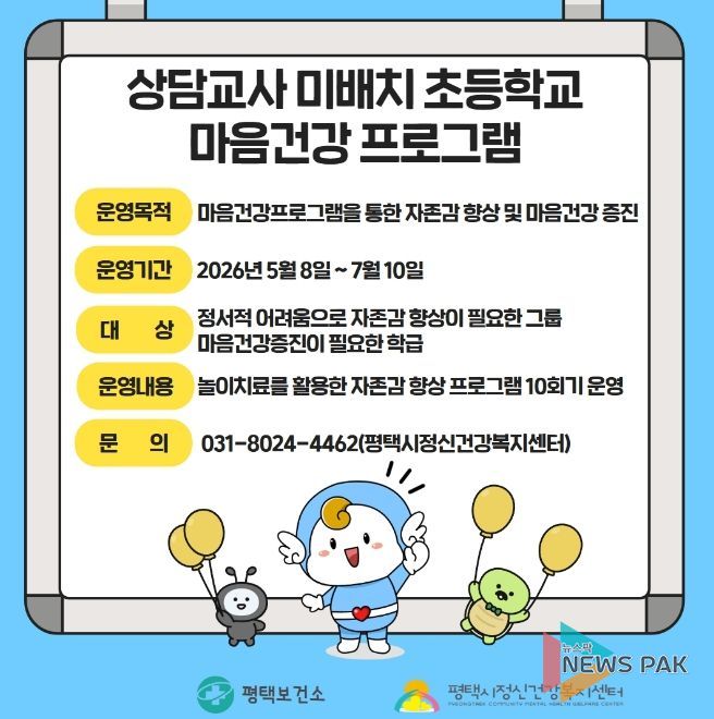 뉴스팍 이소율 기자 | 평택시는 상담교사가 배치되지 않은 초등학교 학생들의 정신건강 지원을 위해 ‘마음건강 프로그램’을 운영한다고 밝혔다.