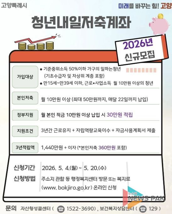 뉴스팍 배상미 기자 | 고양특례시는 5월 4일부터 시작하는 청년내일저축계좌 신규 가입자 모집을 앞두고, 가입 독려에 나섰다.