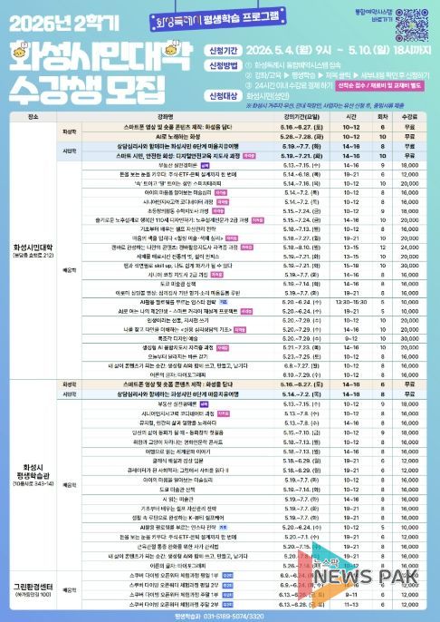 뉴스팍 류은정 기자 | 화성특례시는 2026년 화성시민대학 2학기 수강생을 오는 5월 4일부터 5월 10일까지 선착순으로 모집한다고 밝혔다.