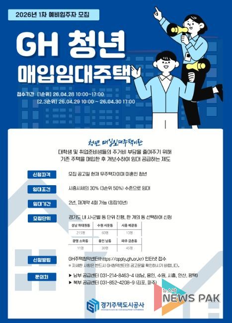 뉴스팍 배상미 기자 | 경기주택도시공사(GH)가 청년층 주거 부담을 덜고 안정적인 생활 기반을 마련할 수 있도록 청년 및 자립준비 청년을 위한 매입임대주택 예비입주자 396명을 모집한다고 27일 밝혔다.