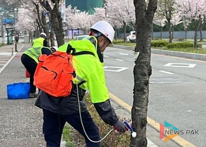 뉴스팍 류은정 기자 | 화성특례시 만세구는 최근 증가하는 식엽성 해충 피해에 대응하기 위해 주요 벚나무길을 중심으로 수간주사 방제를 실시했다고 27일 밝혔다.