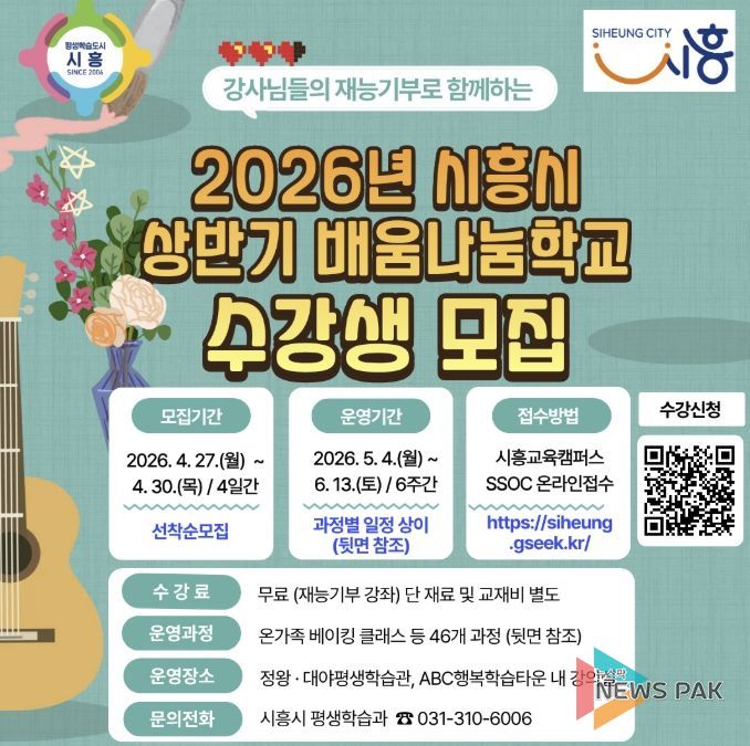 뉴스팍 배상미 기자 | 시흥시는 시민이 직접 강사가 되어 재능을 나누는 열린 평생학습 사업 ‘2026년 상반기 시흥시 배움나눔학교’에 참여할 수강생을 모집한다.