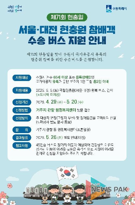 뉴스팍 배상미 기자 | 수원특례시가 제71회 현충일인 6월 6일, 국립현충원(서울·대전)까지 이동이 여의치 않은 국가유공자 유족을 위해 현충원 왕복 수송버스를 운행한다.