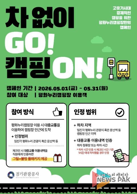 ‘차 없이 GO, 캠핑 ON’는 대중교통을 이용해 캠핑장을 방문하는 고객에게 혜택을 제공하는 캠페인이다. 대중교통 이용 내역을 인증하면 참여할 수 있으며, 참여 고객에게는 그릴과 불멍을 동시에 즐길 수 있는 ‘그릴+불멍 풀패키지’(48,000원 상당) 상품이 제공된다. 대중교통 이용 인정 범위는 문산역 또는 임진각 평화누리 관광지 일원 하차를 기준으로 하며, 이후 캠핑장까지는 도보 또는 택시 이용이 허용된다. 자세한 사항은 평화누리캠핑장 누리집을 통해 확인할 수 있다.