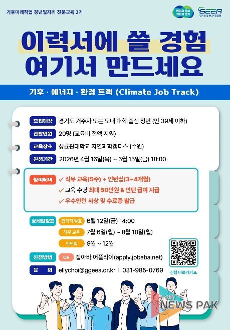 뉴스팍 배상미 기자 | 경기도와 경기환경에너지진흥원은 도내 기후·에너지·환경 분야 기업 취업을 희망하는 청년을 대상으로 ‘기후미래직업 청년일자리 전문과정’에 참여할 교육생 20명을 5월 15일까지 모집한다.