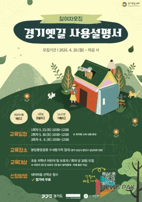 뉴스팍 배상미 기자 | 경기문화재단 경기역사문화유산원은 초등 저학년 어린이와 보호자를 대상으로 하는 역사문화예술 프로그램 ‘경기옛길 사용설명서’ 참가자를 모집한다고 밝혔다.
