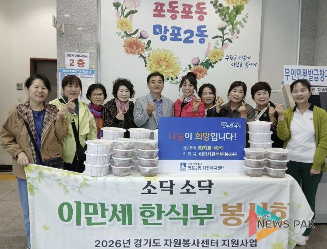 뉴스팍 배상미 기자 | 수원시 영통구 망포2동은 지난 28일 이만세 한식부 봉사회가 관내 경로당 어르신들을 위해 밀키트 40식을 기부하며 따뜻한 나눔을 실천했다고 밝혔다.