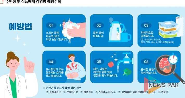 예방을 위해서는 ▲올바른 손씻기 생활화 ▲음식 충분히 익혀 먹기 ▲물 끓여 마시기 ▲설사 증상 시 음식 조리 금지 ▲위생적인 조리 환경 유지 등 개인위생 수칙을 철저히 지켜야 한다.