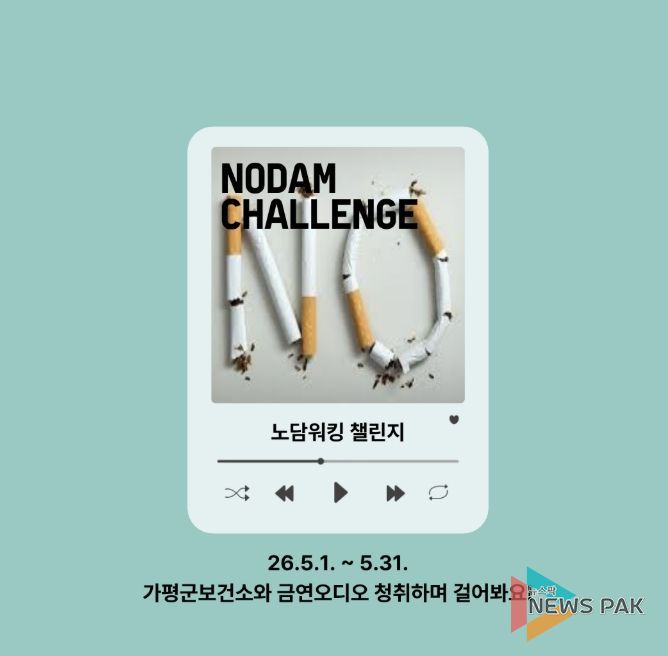 뉴스팍 배상미 기자 | 가평군보건소가 ‘세계 금연의 날’을 앞두고 5월 1일부터 한 달간 금연 인식 확산을 위한 ‘노담워킹 챌린지’를 진행한다. 이번 행사는 일상 속 걷기 실천과 금연 홍보를 병행해 군민들의 건강한 생활 습관 형성을 돕고자 마련됐다.