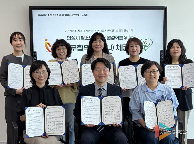 뉴스팍 배상미 기자 | 안성시청소년상담복지센터는 지난 27일 안성맞춤공감센터에서 다함께돌봄센터 경기도협의회 안성지회와 청소년의 건강한 성장과 복지 증진을 위한 업무협약(MOU)을 체결했다.
