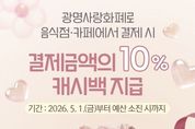 뉴스팍 배상미 기자 | 광명시가 5월 가정의 달을 맞아 가족 외식은 즐겁게, 골목상권은 활기차게 만드는 특별한 캐시백 혜택을 제공한다. 시는 오는 5월 1일부터 5월 한 달간 음식점·카페에서 광명사랑화폐로 결제하는 경우 결제 금액의 10%를 환급하는 ‘가족 외식비 캐시백 지원사업’을 추진한다고 28일 밝혔다. 이번 사업은 고물가 상황에서 외식 수요가 집중되는 가정의 달을 맞아 시민들의 가계 부담을 실질적으로 덜어주는 한편, 소비 침체로 어려움을 겪는 지역 소상공인을 돕기 위해 마련했다. 캐시백 혜택은 광명사랑화폐 가맹점 중 음식점과 카페에서 결제할 때 적용된다. 특히 지역화폐 사용처를 오는 8월 31일까지 고유가 피해지원금 기준에 맞춰 연매출 30억 원 이하 업체까지 한시적으로 확대하면서, 가족 외식비 캐시백 혜택을 받을 수 있는 가맹점 범위도 함께 넓어졌다. 결제액(인센티브, 정책수당 결제분 제외)의 10%를 1인당 최대 1만 원까지 광명사랑화폐로 즉시 환급받을 수 있으며, 준비된 예산이 소진하는 경우 조기 종료한다. 지급된 캐시백은 지급일로부터 1개월 이내 사용해야 하